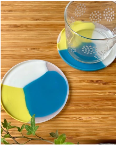 このコースターは、就労支援施設B型の利用者が手作業で混ぜ合わせた複数色のシリコン素材をもとに製作されたもの。色の混ざり方はすべて異なり、一つとして同じ模様はない。