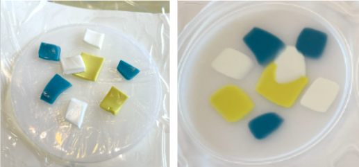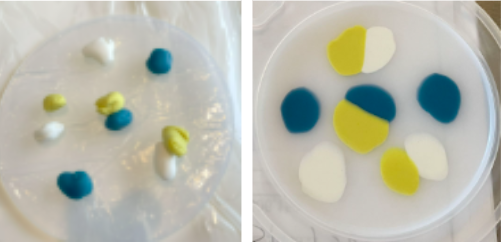 - 色が放射線状に広がるようにしたい。前回は色シリコンをぶつ切りにしたが、今回は団子状に丸め、複数色が隣り合うように並べた。